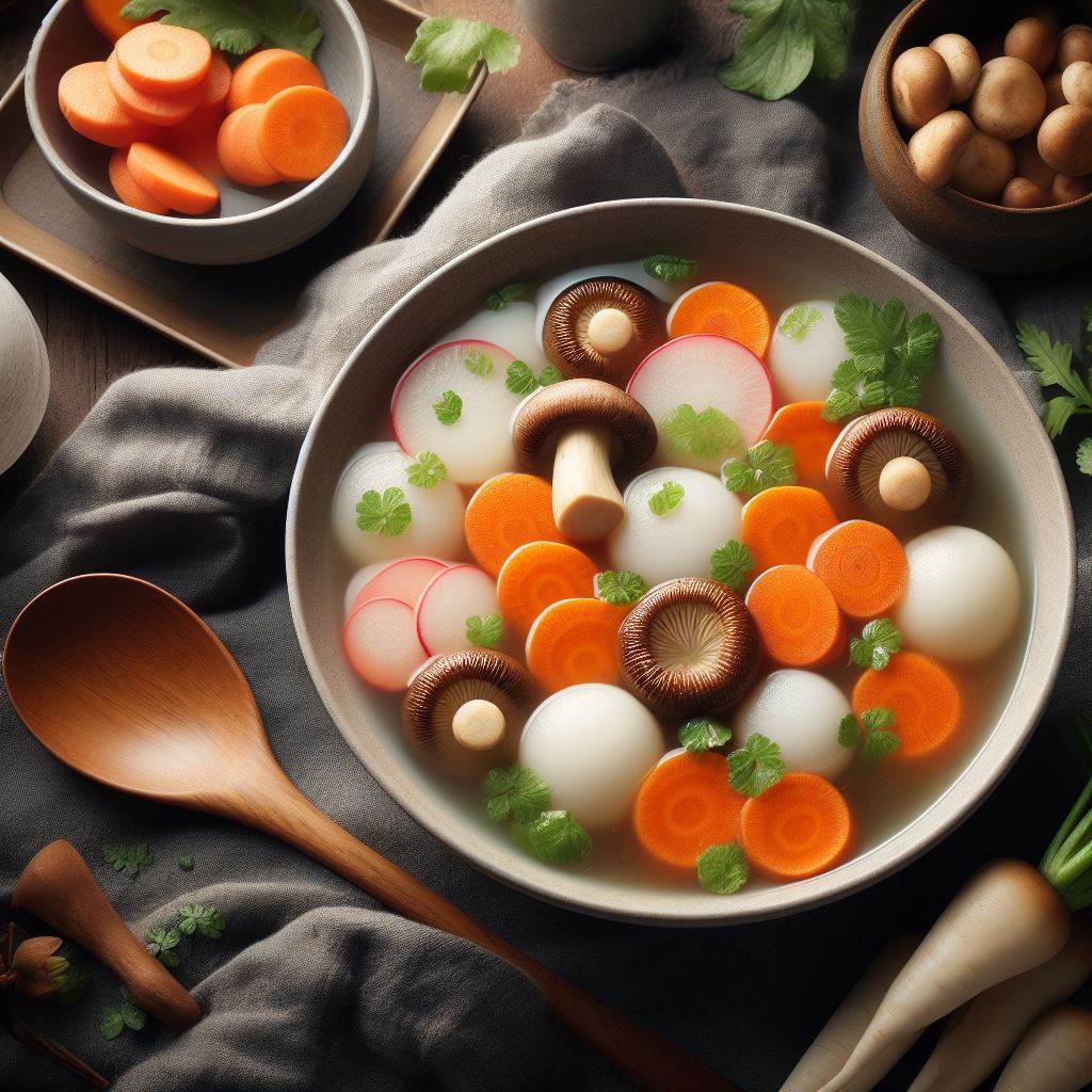 Canh củ cải: củ cải 100g, cà rốt 50g, nấm hương 20g, thịt giò heo 50g.