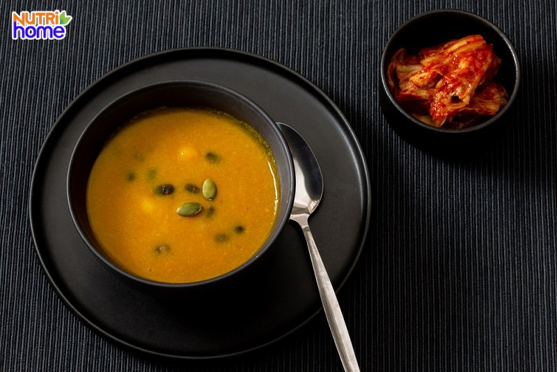 - Xay nhuyễn bí và đậu, cho vào nước sôi, bắt lên bếp.